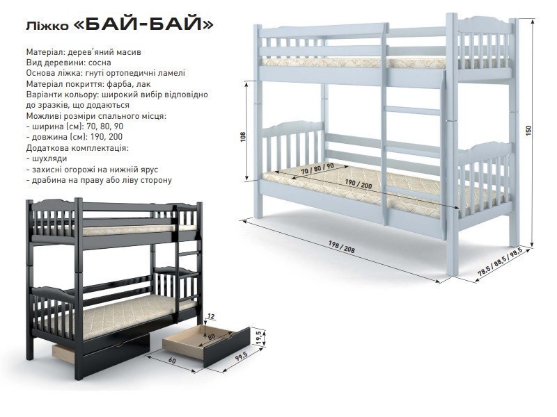 Детские кровати деревянные Бай –бай отличаются от других моделей возможностью трансформации двухъярусного варианта в две полноценные односпальные конструкции, если возникает такая необходимость.